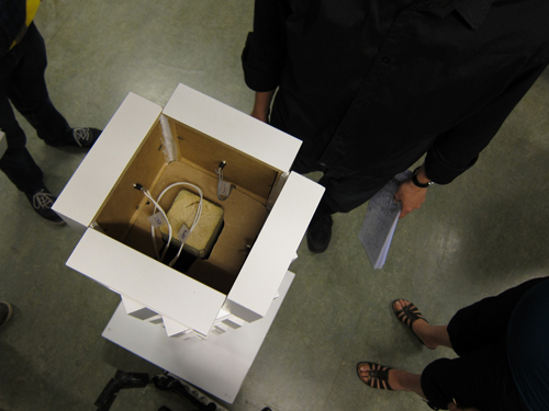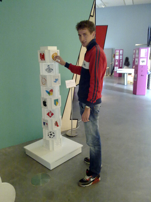 The installation takes form in a 1,5 meters high pillar, that allows multiple children playing with it simultaneously. 32 different logo’s carry out their meaning through a verb and a noun. By pushing 3 logos after another, children can create a sentence that is spoken out through the installation’s speakers. The first pushed logo results in a noun, the second in a verb and the third in a noun.