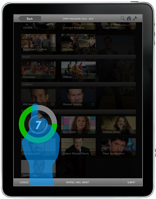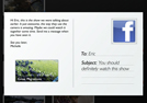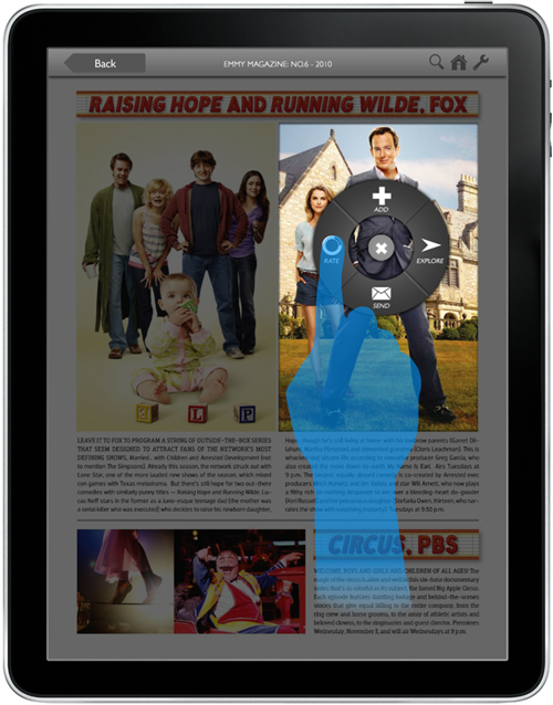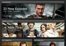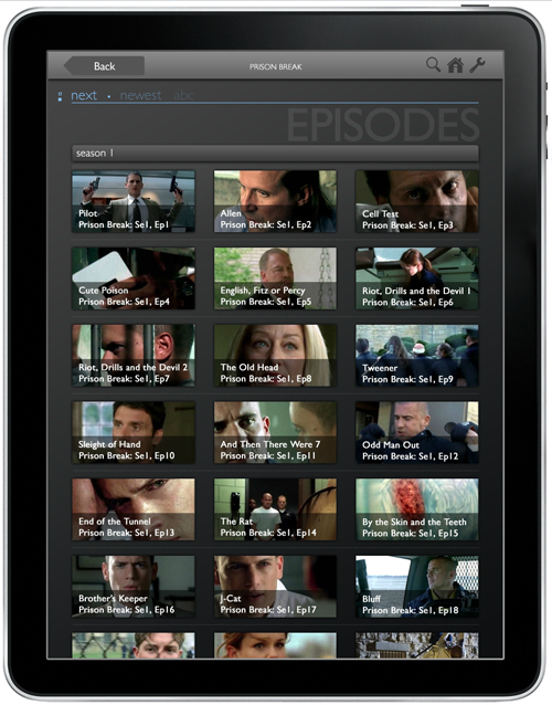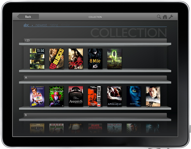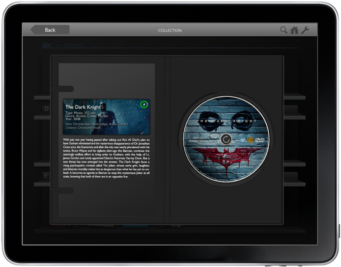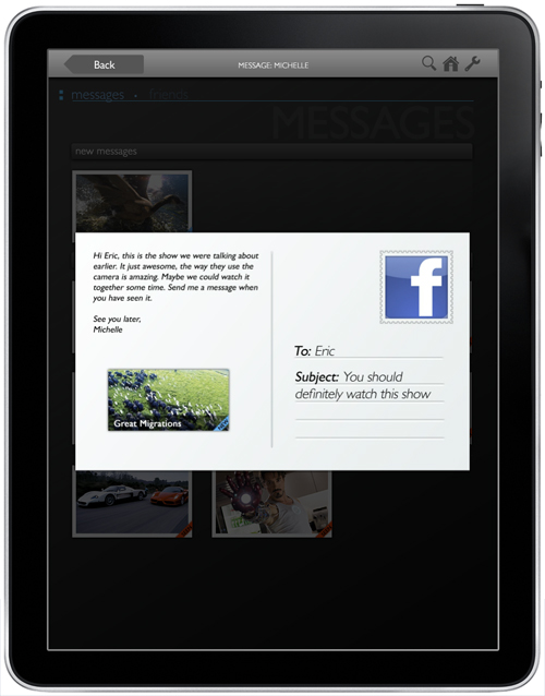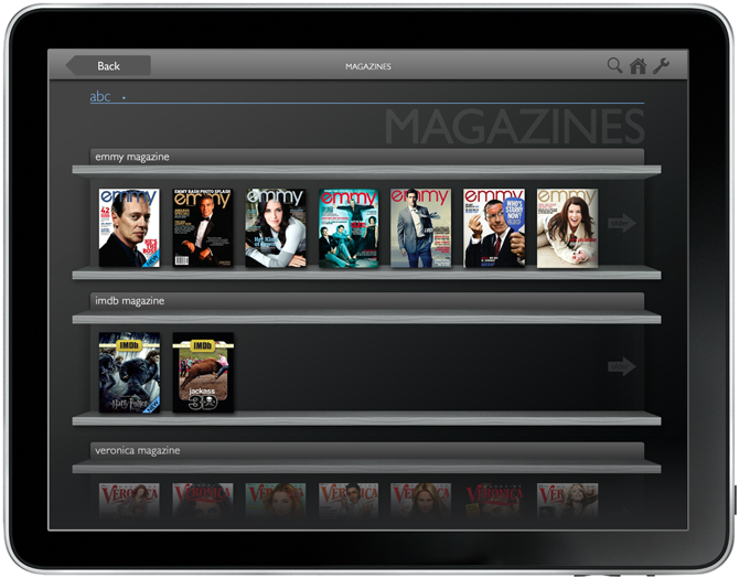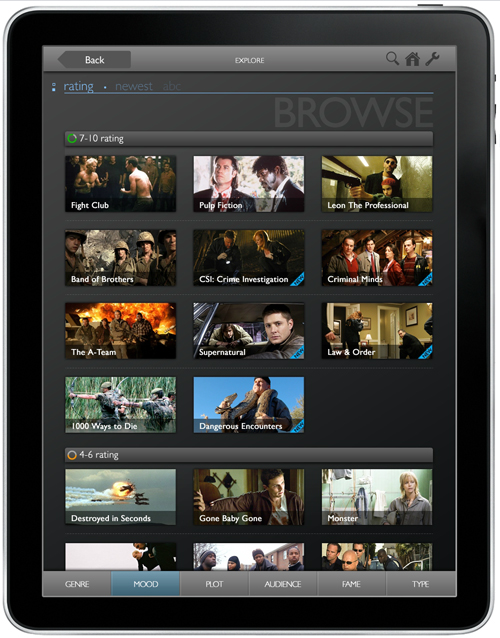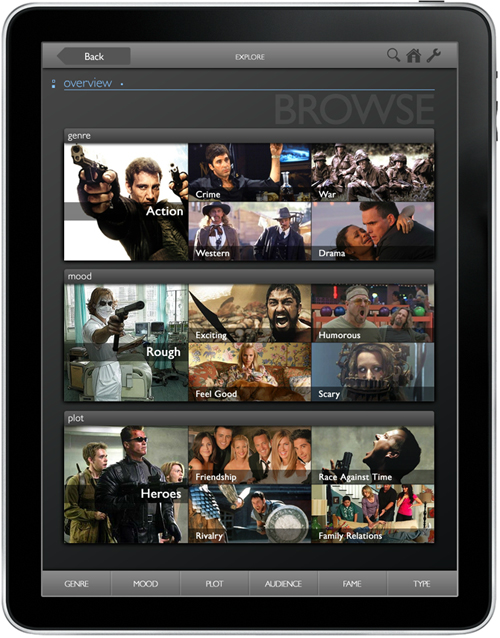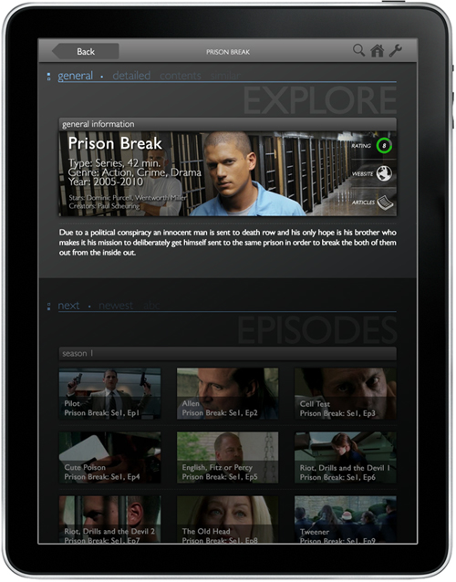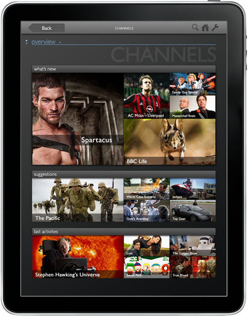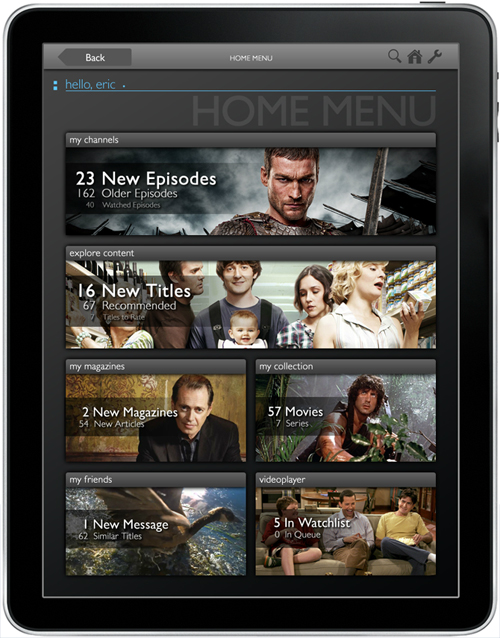 The user interface starts at a home screen, which shows different sections. You can choose to browse personal channels, explore new content, read magazines, view your movie collection, watch recommendations from friends and watch content in a player. The interface makes maximum use of visual visual material, working with overlays to maximize image size. All images link to other pages, and also facilitate quick menus that are accessible throughout the entire application. Furthermore, all different sections have a similar horizontal and vertical lay-out, making it easy to predict following pages and content.